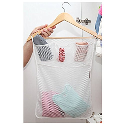 Le sac de rangement en maille a 4 compartiments, trois petits et un grand. Il est solide et bien en polyester, et il s'attache à carrelage et verre 2 crochets qui se fixe facilement et en toute sécurité à n'importe quel grand mur. La matière du sac permet également tous les jouets humide pour se sécher comme ils sont stockés, si possible plus humide jouets.