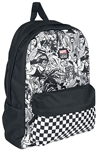 La description : Vans presents a truly unique collaboration with Marvel to bring a superhero twist to their classic range of trainers and apparel, featuring the artwork of the most loved comic book characters and iconic symbols. Other features include a custom black and off white print of heroines, a main compartment complemented with a smaller front compartment, a top handle and signature Vans branding details. • Padded adjustable shoulder straps • 100% polyester
